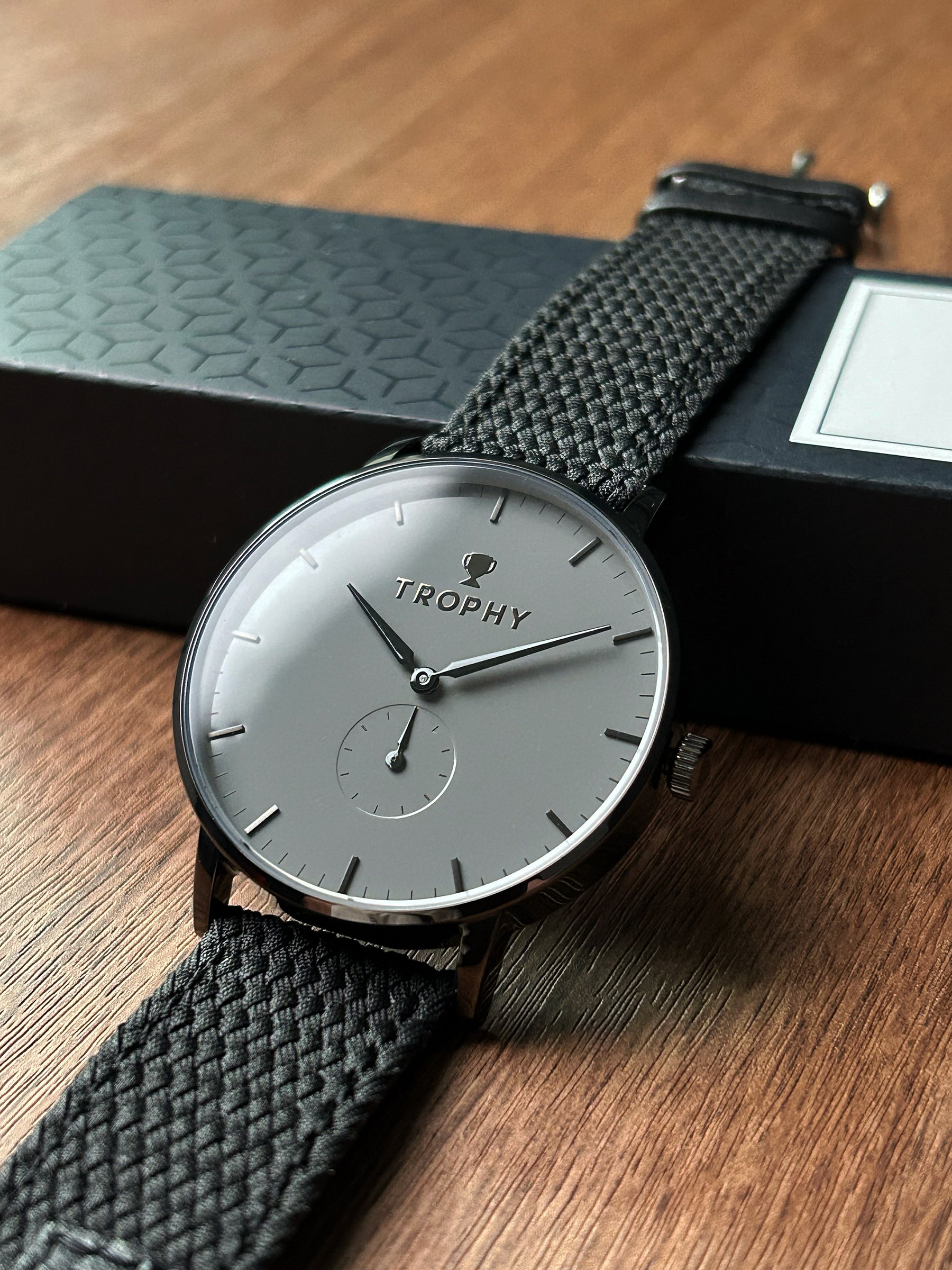 The Eclipse Perlon is a blackout dress watch that combines a polished black case, a grey dial and black hands/logo. It can be worn anywhere you want to go - from semi-formal gatherings to casual get-togethers. It's designed with a slim, lightweight case that sits comfortably on your wrist, and a braided perlon strap lined with high quality leather.